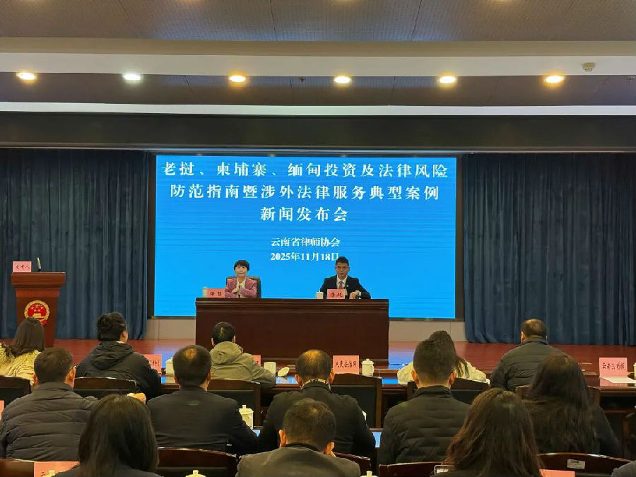 20251118日,云南省律师协会召开老挝、柬埔寨、缅甸投资及法律风险防范指南暨涉外法律服务典型案例新闻发布会。十四届全国人大代表、云南省律师行业党委副书记、省律师协会副会长、女律师分会会长、省律师行业妇联主席张慧介绍云南省涉外法律服务工作基本情况,云南省相关涉外律师发布老挝、柬埔寨、缅甸投资及法律风险防范指南和涉外法律服务典型案例并回答记者提问,省律师协会南亚东南亚涉外法律服务业务研究委员会主任唐超主持发布会。